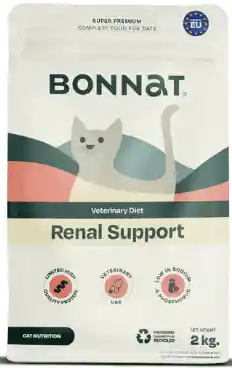 Bonnat Dieta Veterinaria Gato Apoyo Renal x 2 Kg Presentamos un alimento completo diseñado para gatos adultos, con el propósito de brindar apoyo a la función renal en casos de insuficiencia renal crónica. Esta fórmula está destinada a respaldar el manejo de síntomas y enfermedades relacionadas con los riñones de los gatos, protegiendo este importante órgano del deterioro y la progresión de la enfermedad. La recomendación sobre el uso y la duración de este alimento será determinada por el médico veterinario tratante. Ingredientes: Arroz, proteína de maíz, guisantes, huevo deshidratado (7,77%), proteínas de pollo deshidratadas, pulpa de remolacha deshidratada, aceite de salmón (3,79%), sustancias minerales, semilla de lino, proteínas de pollo hidrolizadas, fibra vegetal, grasa de ave, levadura de cerveza. Vitamina A: 20000 UI, Vitamina D3: 1000 UI, Vitamina E: 500 mg, Taurina: 1000 mg. OLIGOELEMENTOS: Hierro (sulfato de hierro (II), monohidratado): 57,0 mg, Zinc (óxido de zinc): 57,0 mg, Manganeso (sulfato manganoso, monohidratado): 22,0 mg, Cobre (sulfato de cobre (II) pentahidratado): 5,7 mg, Yodo (yodato de calcio anhidro): 0,8 mg, Selenio (selenito de sodio): 0,11 mg. %Potasio (valor medio): av. 0,7 – %Sodio (valor medio): av. 0,4 – %Calcio (valor medio): av. 0,6 – %Fosforo (valor medio): av. 0,4 EM calculada: 3695 kcal/kg. Beneficios: Cantidad limitada de proteína de alta calidad. A base de plantas, huevos y fuentes animales. Bajo en sodio y fósforo y rico en ácidos grasos Omega 3 de origen de pescado y huevo. Cantidad limitada de proteína de alta calidad. A base de plantas, huevos y fuentes animales Apoya la función del riñón con el correcto balance de ingredientes.