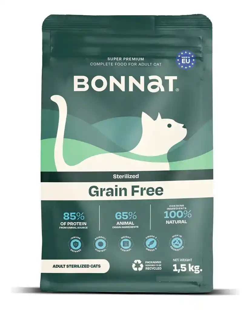 Alimento sin granos para gatos esterilizados. Ayuda a controlar el peso, mejora la digestión y favorece la salud urinaria