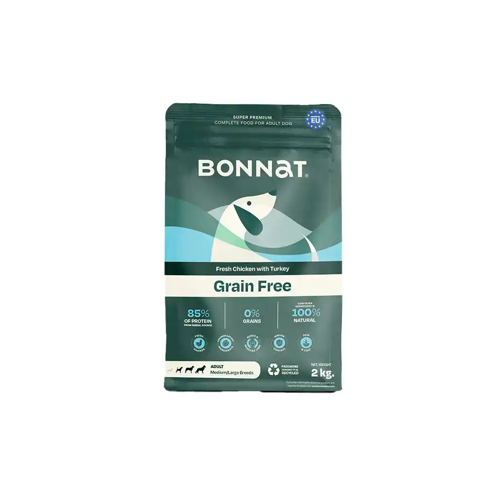 Alimento Super Premium completo y balanceado, para perros adultos de tamaños medianos y grandes a partir de los 15 a 18 meses de vida, pertenece al segmento holístico y natural. Sin granos incluidos, con carnes magra de pollo y pavo, con ingredientes 100% naturales, 85% de proteínas de origen animal, alto en probióticos SF68, sin colorantes, saborizantes o conservantes artificiales.