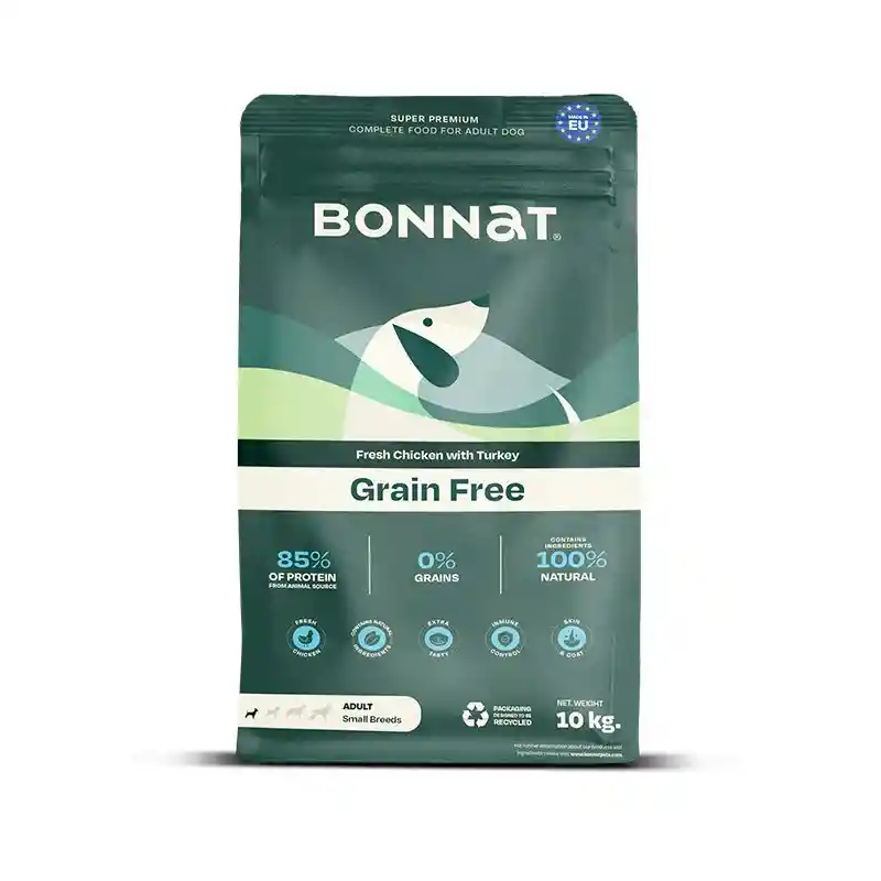 Alimento sin granos para perros adultos de razas pequeñas. Favorece la digestión, proporciona energía óptima y mantiene un pelaje saludable.