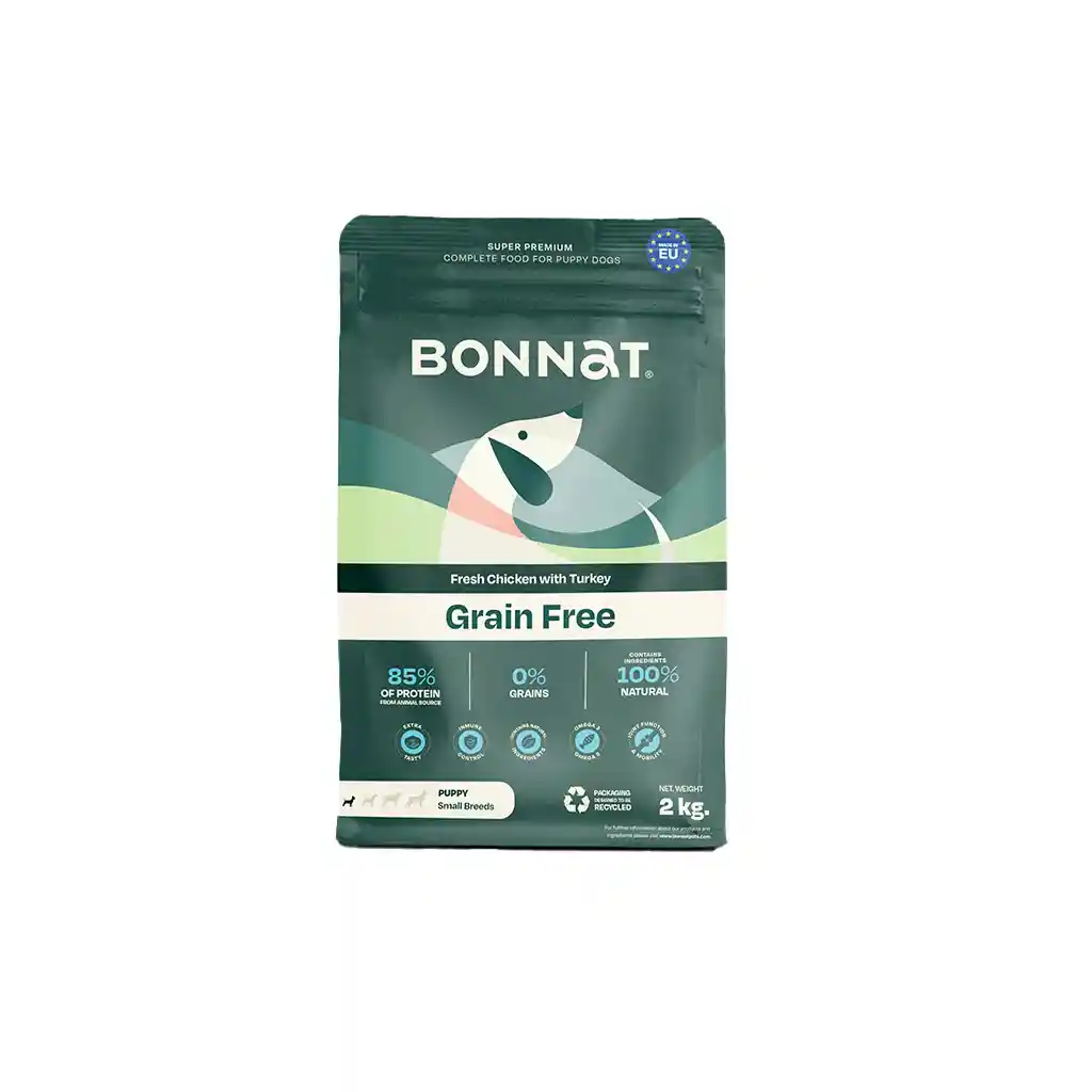 Alimento Super Premium completo y balanceado, para perros cachorros de tamaños pequeños desde el destete hasta los 12 meses, pertenece al segmento holístico y natural. Sin granos incluidos, con carnes magra de pollo y pavo, con ingredientes 100% naturales, 85% de proteínas de origen animal, alto en probióticos SF68, sin colorantes, saborizantes o conservantes artificiales