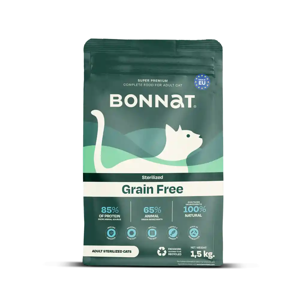 Nombre técnico: Bonnat Grain Free Feline Sterilized 1,5 kg Nombre comercial: Bonnat Grain Free Feline Sterilized, presentación de 1.5 kg Descripción: Bonnat Grain Free Feline Sterilized es un alimento premium especialmente formulado para gatos esterilizados. Este alimento completo y balanceado es libre de granos, lo que lo hace ideal para gatos con sensibilidad a los cereales y para mantener un peso saludable tras la esterilización. Está diseñado para satisfacer las necesidades nutricionales específicas de los gatos esterilizados, ayudando a controlar el peso y promover la salud urinaria. Componentes: Proteínas de alta calidad: Derivadas de fuentes animales seleccionadas, esenciales para el mantenimiento de la masa muscular magra y la vitalidad de los gatos esterilizados. Grasas saludables: Incluyen ácidos grasos omega-3 y omega-6, que son importantes para la salud de la piel y el pelaje, así como para el bienestar general. Bajo en carbohidratos: La formulación sin granos asegura un contenido bajo en carbohidratos, ayudando a prevenir el aumento de peso y a controlar los niveles de glucosa en sangre. Vitaminas y minerales balanceados: Incluye un complejo vitamínico completo (A, D, E y grupo B) y minerales quelados (zinc, hierro, cobre) para apoyar la salud general y el sistema inmunológico. Taurina: Un aminoácido esencial para la salud cardiovascular y ocular de los gatos. Fibra dietética: Incluye fuentes naturales de fibra para mejorar la digestión y promover una salud intestinal óptima. L-Carnitina: Ayuda a metabolizar las grasas, favoreciendo el control del peso en gatos esterilizados. Sabor: El sabor es altamente palatable, formulado para atraer a los gatos y asegurar una ingesta adecuada de nutrientes esenciales, proporcionando un sabor delicioso y natural que los gatos disfrutan. Indicaciones: Bonnat Grain Free Feline Sterilized es adecuado para gatos esterilizados de todas las edades. Raciones diarias recomendadas: Ajustadas según el peso y la condición corporal del gato. Consulte la tabla de alimentación en el empaque para dosis específicas. Modo de empleo: Servir el alimento seco o ligeramente humedecido con agua fresca. Asegúrese de que el gato tenga siempre acceso a agua fresca y limpia. Beneficios: Control del peso: Formulado para ayudar a los gatos esterilizados a mantener un peso saludable. Salud urinaria: Ayuda a mantener el pH urinario adecuado, reduciendo el riesgo de problemas urinarios comunes en gatos esterilizados. Digestión saludable: La fibra dietética promueve una digestión saludable y regula el tránsito intestinal. Salud de la piel y el pelaje: Los ácidos grasos esenciales y las vitaminas apoyan una piel sana y un pelaje brillante. Bonnat Grain Free Feline Sterilized está formulado con ingredientes de alta calidad y la más avanzada tecnología en nutrición felina, garantizando una dieta equilibrada que promueve la salud y el bienestar de los gatos esterilizados.