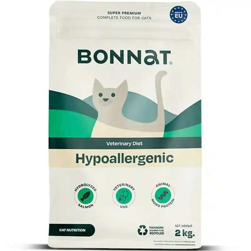Bonnat Veterinary Diet Feline Hypoallergenic es un alimento formulado para gatos con alergias o sensibilidades alimentarias y digestivas. Utiliza salmón hidrolizado como fuente de proteína para evitar reacciones, promoviendo una piel sana y buena digestión. Incluye Omega 3 y es apto para gatos adultos con problemas dermatológicos, con un 28% de proteína bruta. Características Principales: Proteína Hidrolizada: Proteínas de salmón descompuestas para evitar que el sistema inmune las reconozca como alérgenos, reduciendo picazón y problemas digestivos. Salud Dermatológica: Enriquecido con ácidos grasos Omega 3, vitaminas y minerales para proteger la piel y mejorar el pelaje, reduciendo la caída y la irritación. Digestión Saludable: Formulado para gatos con síndrome de mala absorción o intolerancias a proteínas comunes. Ingredientes: Contiene arroz, proteínas de salmón hidrolizadas (20,7%), guisantes, aceite de salmón y pulpa de remolacha. Uso: Dieta de prescripción para gatos adultos, recomendada bajo supervisión veterinaria durante 3 a 8 semanas, pudiendo extenderse. Este alimento es una solución especializada para mejorar la calidad de vida de felinos con sensibilidades, siendo libre de proteínas comunes causantes de alergias.