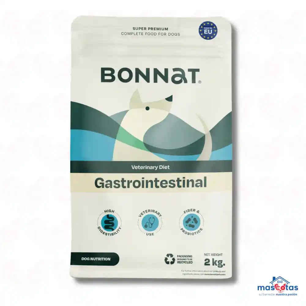 Bonnat Veterinary Diet Canine Gastrointestinal es un alimento súper premium seco, formulado para perros de todas las edades con trastornos digestivos agudos o crónicos. Su fórmula altamente digestible, con ingredientes naturales y bajo contenido de grasa, ayuda a la absorción de nutrientes, estabiliza el tránsito intestinal y apoya la recuperación de afecciones gastrointestinales. Características Principales y Beneficios: Alta Digestibilidad: Diseñado para facilitar la absorción de nutrientes, aliviando molestias estomacales y la carga sobre el sistema digestivo. Salud Intestinal: Enriquecido con prebióticos y probióticos que mejoran la digestión, la consistencia de las heces y promueven una flora intestinal saludable. Balance de Electrolitos: Niveles elevados de electrolitos para compensar las pérdidas de minerales durante procesos de diarrea o vómito. Proteínas de Calidad: Contiene proteínas de alta calidad (como pollo y huevo) para facilitar la digestión. Uso: Dieta de prescripción veterinaria, ideal para perros con problemas gastrointestinales, sensibilidad digestiva o durante la convalecencia. Recomendación: Se recomienda su uso bajo supervisión del médico veterinario para determinar la duración del tratamiento