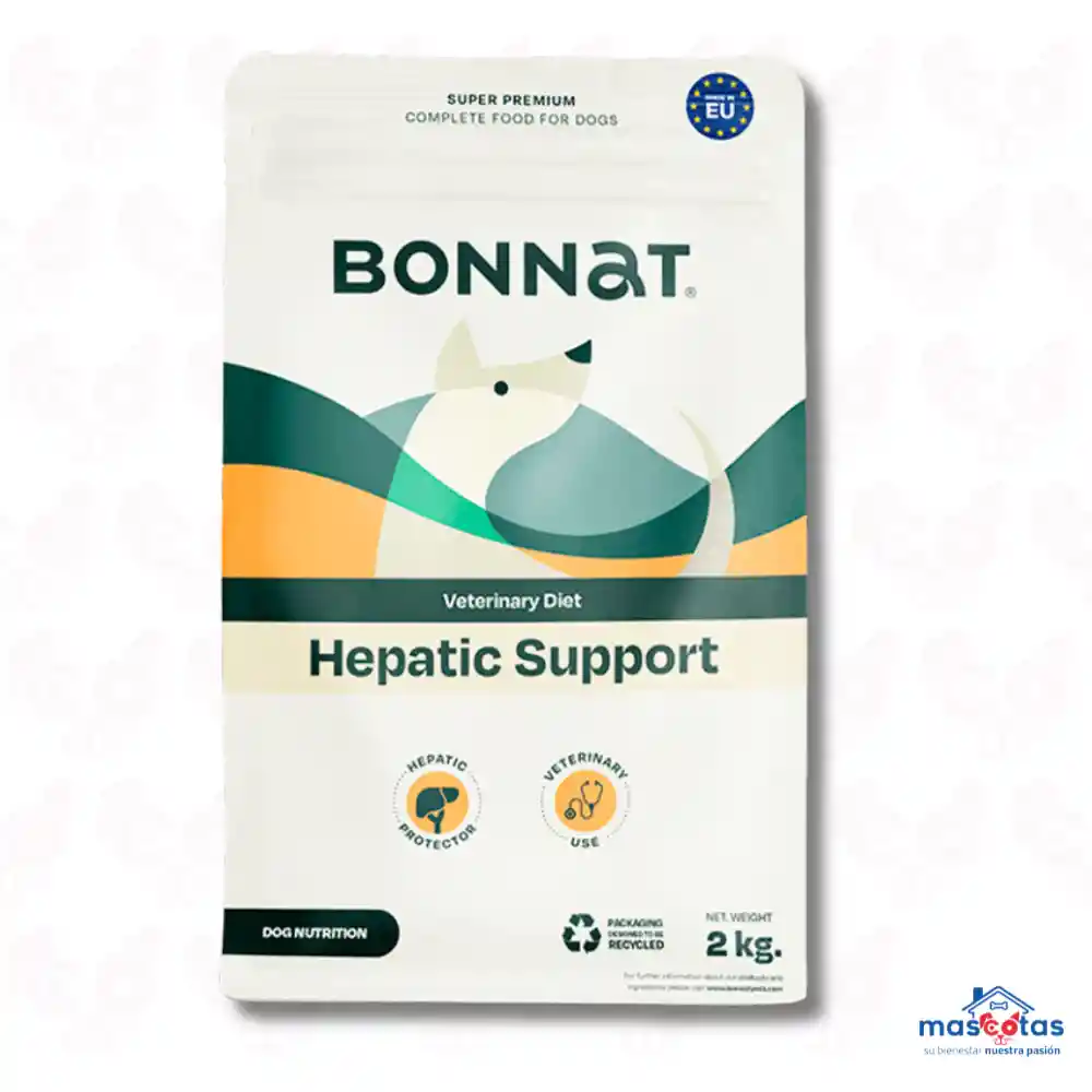 Bonnat Veterinary Diet Canine Hepatic Support es un alimento súper premium diseñado para perros con enfermedades hepáticas. Su fórmula especializada reduce la carga metabólica, favorece la regeneración del tejido, contiene cardo mariano (silimarina) para proteger el hígado, y ácidos grasos omega-3 para el metabolismo, mejorando el bienestar general bajo supervisión veterinaria Características y Beneficios Principales: Protección Hepática: Contiene cardo mariano, fuente de silimarina, que actúa como antioxidante e inmunomodulador, protegiendo las células del hígado. Soporte Nutricional: Formulado con proteínas de alta calidad (pollo e huevo) en niveles moderados para evitar la sobrecarga del órgano y favorecer su regeneración. Ácidos Grasos Esenciales: Incorpora aceite de salmón y semillas de lino, fuentes de Omega-3 y lignanos, que ayudan al metabolismo de las grasas y reducen la inflamación. Alta Digestibilidad: Ingredientes seleccionados como arroz y proteínas hidrolizadas facilitan la digestión y absorción de nutrientes. Uso: Dieta de prescripción, se recomienda su uso bajo supervisión veterinaria, frecuentemente indicado por periodos de hasta 4 meses. Composición (Ingredientes clave): Arroz, proteínas de pollo deshidratadas (10.6%), huevo deshidratado (10%), grasa de ave, maíz, proteínas animales hidrolizadas, semilla de lino (1.88%), pulpa de remolacha, levadura de cerveza, aceite de salmón, cardo mariano deshidratado (0.15%). Uso Recomendado: Para perros de todas las edades con problemas hepáticos, insuficiencia hepática o requerimiento de soporte en la función del hígado