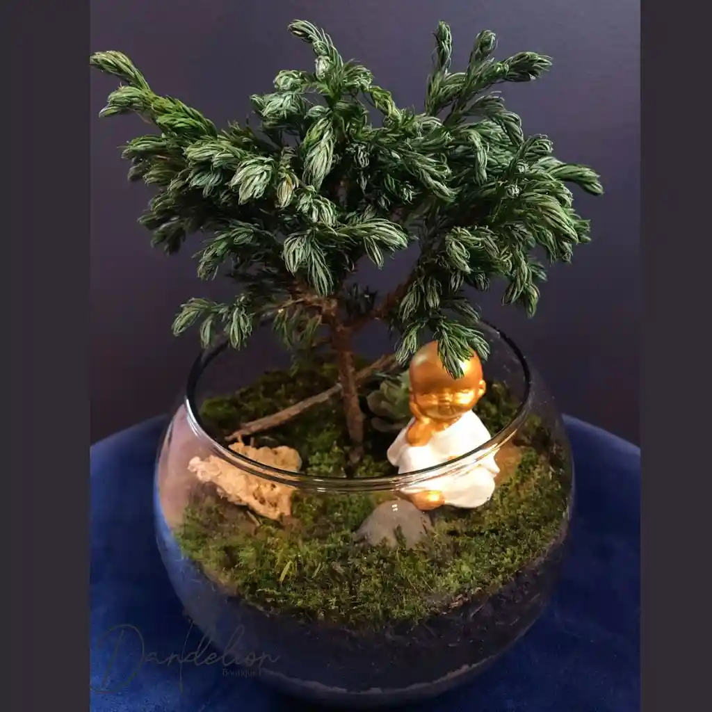 BONSAI EN ESFERA TIPO TERRARIO, ACOMPAÑADO DE SUCULENTA Y MINI BUDA. EL ARBOL PUEDE CAMBIAR TENEMOS VARIAS OPCIONES.