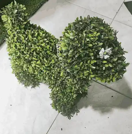 La imagen muestra una escultura de topiario con forma de perro, elaborada con follaje artificial de color verde vibrante que simula hojas pequeñas y densas. El perro está representado de perfil, con un cuerpo compacto y patas cortas y robustas. La cabeza del perro tiene dos pequeñas flores azules insertadas cerca de la "oreja" derecha, y lleva un collar de tela blanca con puntos negros alrededor del "cuello".