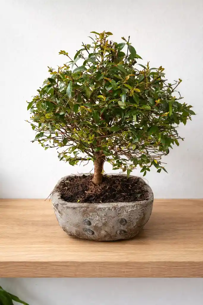 Una planta compacta y frondosa, con hojas verdes brillantes y brotes nuevos en tonos más claros que le dan vida y frescura. Su forma redondeada y densa crea una apariencia elegante y armoniosa, perfecta para espacios exteriores. El bonsái guayacán es de luz solar directa o semidirecta, ideal para balcón, terraza o jardín. Medidas: 25 x 40 cm altura aprox.