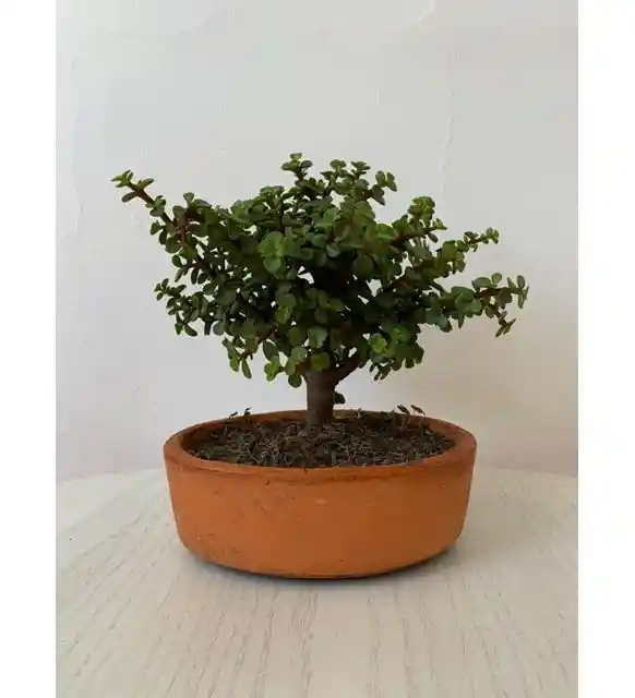 Planta tipo Bonsai Jade , con matera decorada y tarjeta con mensaje personalizado