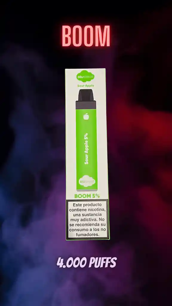 GluCloud Boom Sour Apple 4.000 Puffs Prohibida la venta a menores de edad. Producto nocivo para la salud que contiene nicotina, sustancia altamente adictiva. Antes de consumir consulte las indicaciones y contraindicaciones de uso