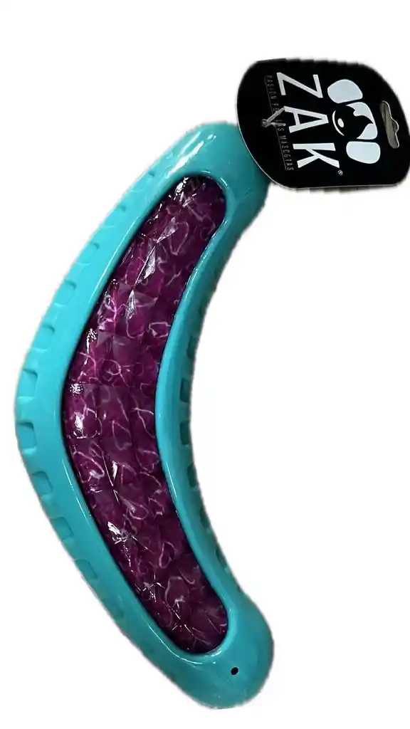 boomerang de goma con sonido chillón para perro, celeste con rosado