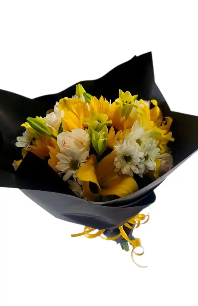 Bouquet con 3 lirios amarillos, 5 rosas blancas y margaritas blancas.