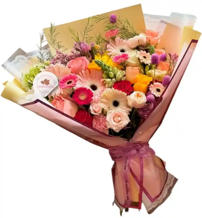 Sorprende sin motivo con la belleza atemporal de nuestras flores. Son un mensaje del corazón que aporta pura alegría a cualquier ocasión." BOUQUET CON GERBERAS,ROSA,MINI ROSA,BOQUITA DE DRAGÓN, HORTENSIA,SIEMPRE VIVA,FOLLAJE,PAPEL DECORATIVO Y MOÑO