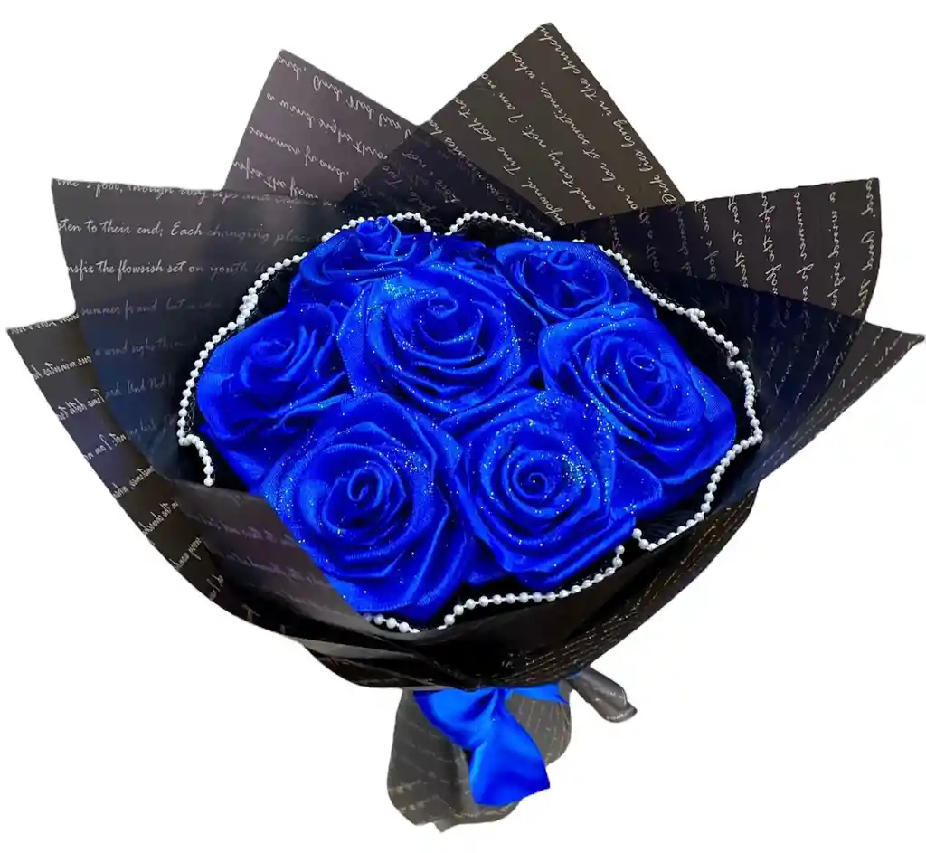 El azul a menudo se asocia con la imaginación y lo onírico. BOUQUET CON ROSAS ETERNAS, AZULES PAPEL DECORATIVO , MOÑO Y TARJETA PERSONALIZADA