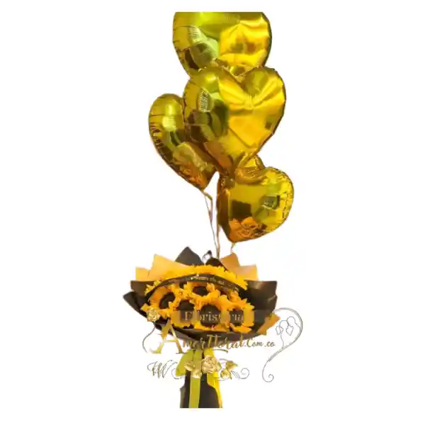 bouquet por 12 Girasoles, cinta marcada, 4 globos en helio metalizados r-18, si deseas un mensaje para la tarjeta lo puedes dejar escrito en el área de observaciones o escribirnos al whatsapp al 3143111616 y enviarnos el mensaje para la tarjeta.