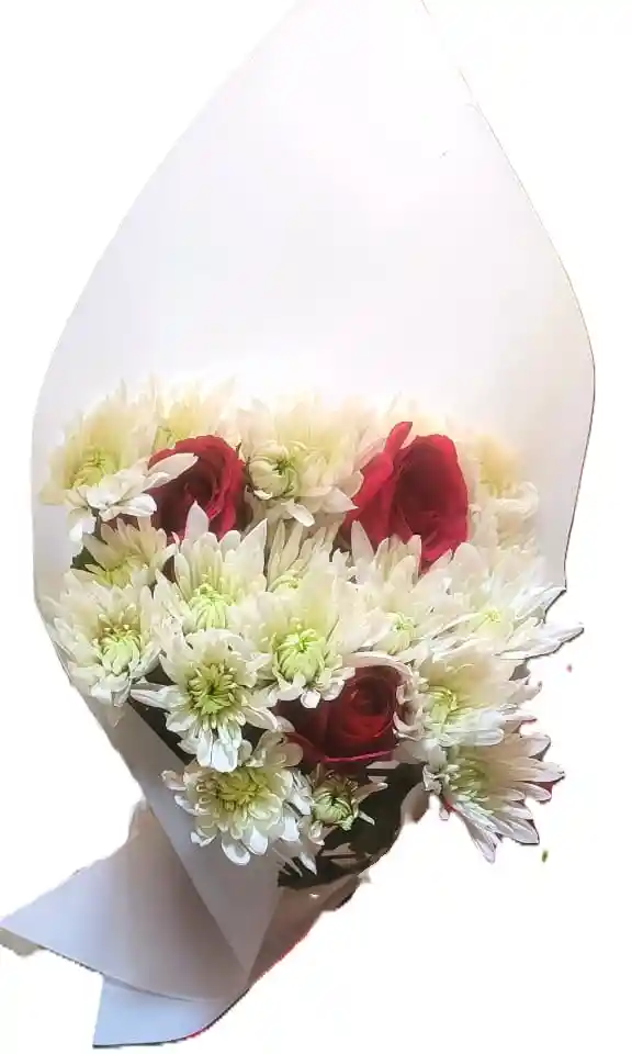 Un detalle elegante y significativo que combina la delicadeza de los crisantemos blancos con la fuerza de las rosas rojas, creando un contraste único que transmite pureza, amor y pasión. con 3 rosas rojas y margaritas blancas
