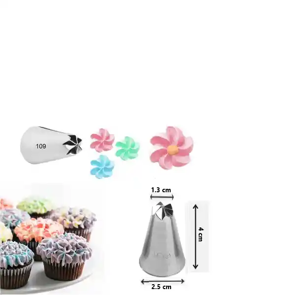Boquilla punta de flor 6 puntas, ideal para realizar flores estrelladas o remolinos con agujero central. Acero Inoxidable. Medidas: Base 2.5 cm Apertura 1.3 cm
