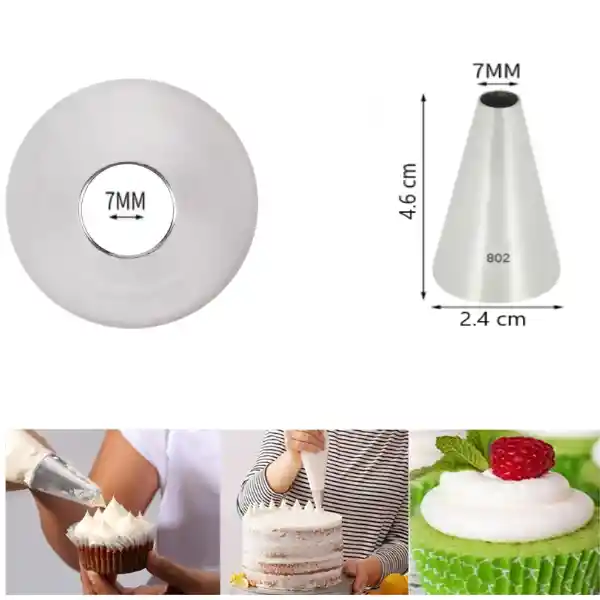 Boquilla lisa de punto o punta redonda fabricada en acero inoxidable resistente, para decorar cupcakes, tortas y galletas. Es ideal para la elaboración de macarons. Medidas: Base 2.4cm Apertura 7mm