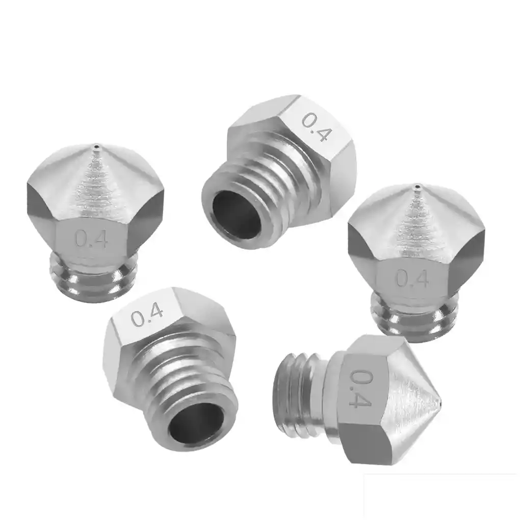 Tamaño: 13mmx9mm. Material: Acero inoxidable. Tamaño de la boquilla: 0.4mm Tornillo roscado: M7. Tornillo de diametro exterior: 9mm. Adecuado para filamentos: 1.75mm. LA COMPRA INCLUYE: 1X BOQUILLA ACERO INOXIDABLE MK10 0.4mm