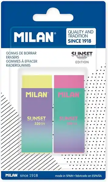 Gomas de borrar de alta calidad. Diseño elegante y moderno de la Serie Sunset Milan. Blíster con dos unidades para mayor conveniencia.