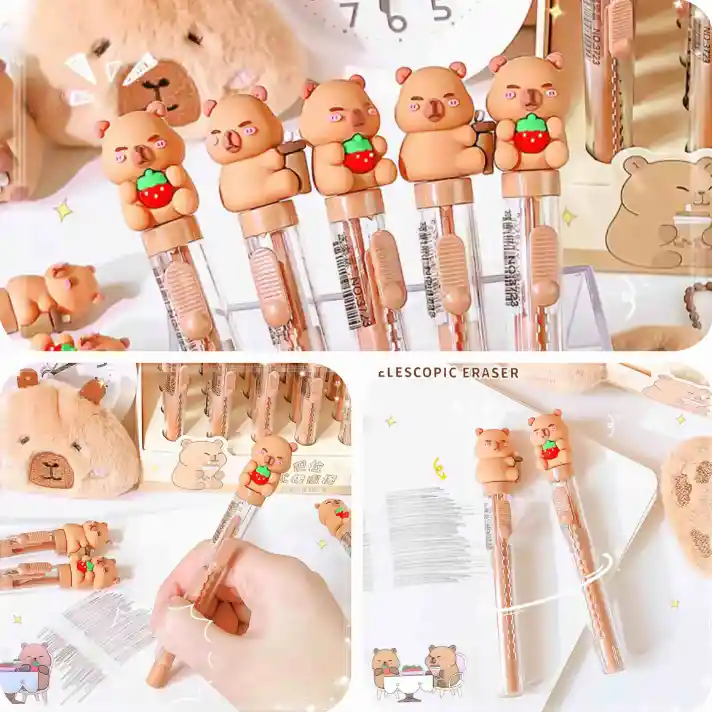 Borrador retráctil con diseño de capibara, práctico y adorable para el uso diario escolar u oficina. Su sistema retráctil protege la goma, evita que se ensucie y permite un uso más preciso y duradero. Fabricado con material de alta calidad, borra de manera suave y efectiva sin dañar el papel ni dejar residuos excesivos. Su diseño compacto y ergonómico lo hace fácil de transportar en cartucheras o bolsos, convirtiéndolo en el complemento perfecto para estudiantes y amantes de la papelería kawaii. 🧡✏️