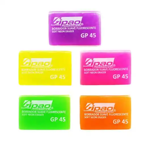 Borrador de colores tipo miga de pan, muy suaves hechos con materiales que se separan en partículas al hacer fricción con el papel esto ayuda a que el borrador absorba muy bien el grafito en todos las variedades de dureza. El borrador tipo miga de pan es muy utilizado por todas las áreas de dibujo o escritura a lápiz ya que es ideal borrando muy eficazmente el rastro de todas las gamas de lápices, sin dejar manchas ni dañar el papel. A la vez es muy suave y genera una gran facilidad para manejar con varios tipos de papeles, quita las marcas de grafito de manera rápida. Colores fluorescentes: verde, naranja, morado, azul, rosado.