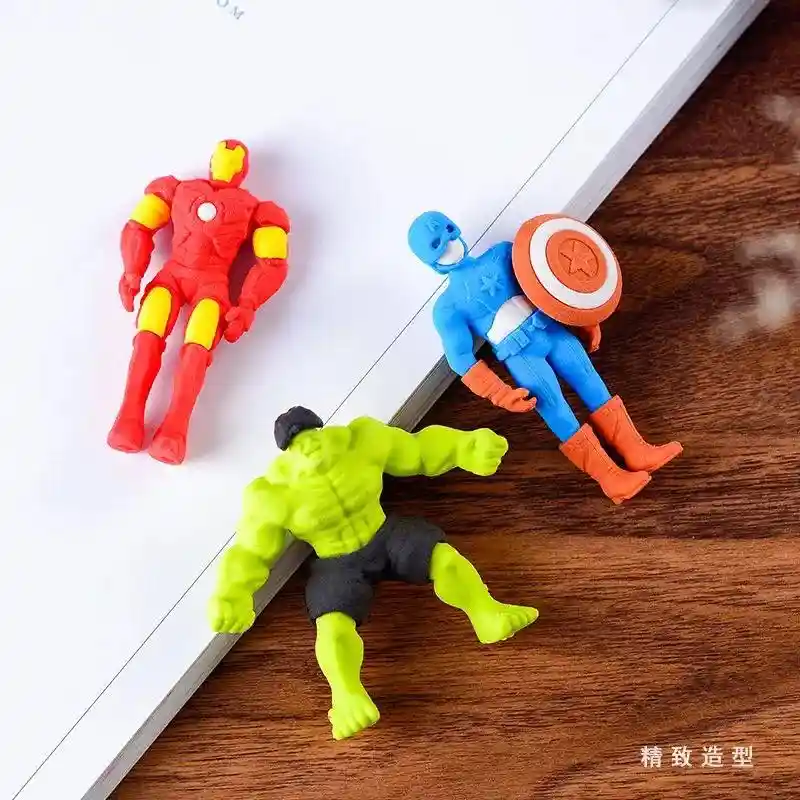 *Incluye 3 borradores desarmables. 1x Borrador Hulk 1x Borrador Iron Man 1x Borrador Capitán América Importante: Debido a la diferencia de pantallas y efecto de la luz, el color real del artículo puede ser ligeramente diferente al color mostrado en las imágenes.