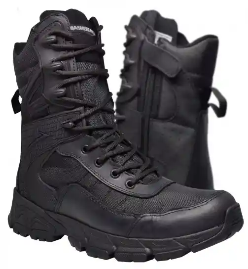 Calzado ergonómico táctico. cuero graso hidrofugado / cordura nylon poliéster. fibra termo inyectada. caucho antideslizante. poliuretano con air tecnology (capsula de aire oculta en el talón). anatómica y ergonómica. material pu con tecnología anti-shock preformada. disminución de sudoración y calor. transpirable y fresca para proteger del mal olor y la formación de bacterias. airflow textil con ventilación entre capas tridimensionales. libera la humedad y se mantiene seco y fresco. adicional características antibacterianas. tecnología outlast. centro montado plantilla y cambrión antiestático. pegado vulcanizado.