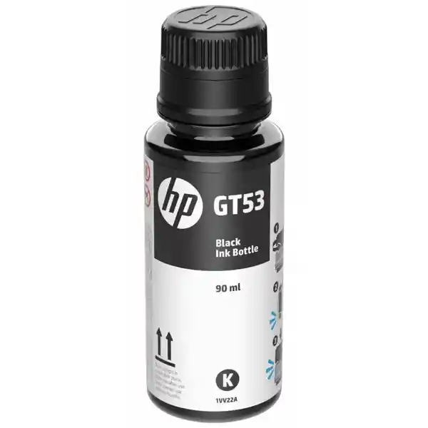 Tinta HP 1VV22AL #GT53 Negro rend aprox 4.000 pag. 90 ml Compatibilidad: HP Deskjet GT5800 Series. HP Ink Tank 300/400 Series. HP Smart Tank serie 510. HP Smart Tank Plus serie 550. HP Smart Tank Plus serie 610