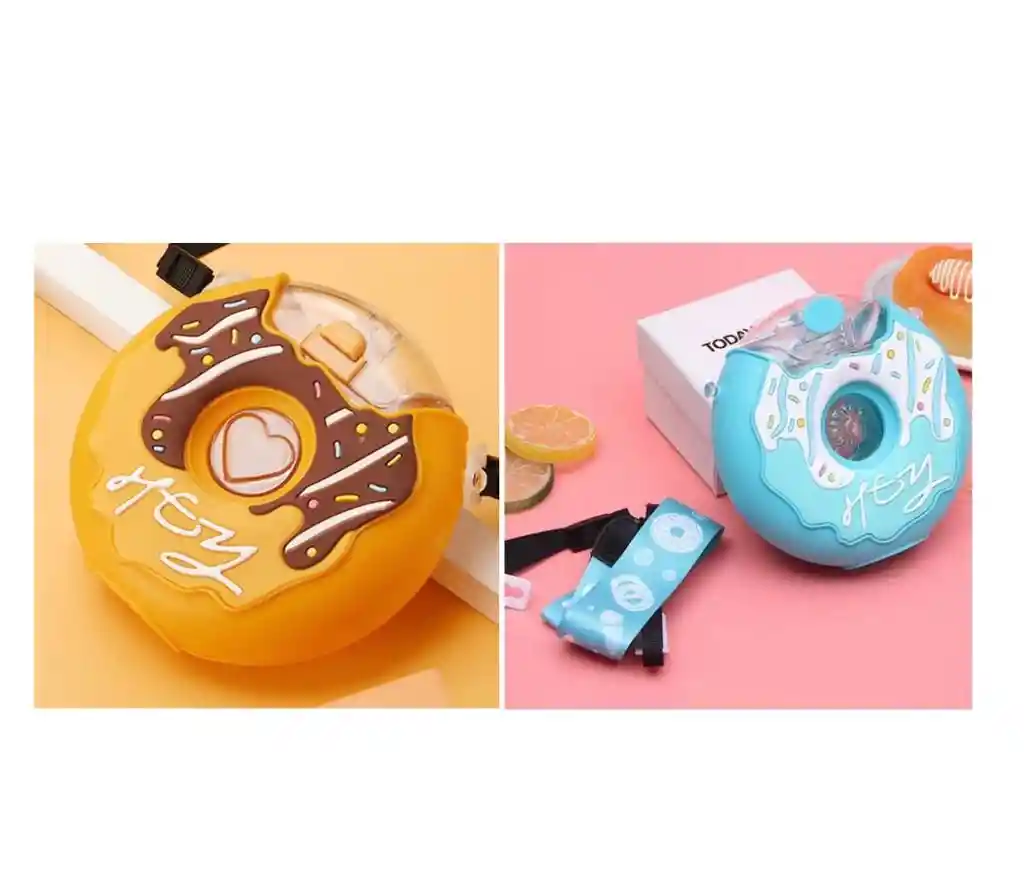 Divertida cantimplora en forma de dona azucarada. Esta original botella cantimplora es el regalo ideal para jovencitas ,niñas y niños. Ideal para llevar agua fresca, leche, jugo o cualquier bebida para los más pequeños del hogar.facil de cargar por su correa. Material: Plástico Color: se envia diseño y color a disponivilidad de inventario Capacidad: 380ml Dimensiones: 11x 11x 5cm