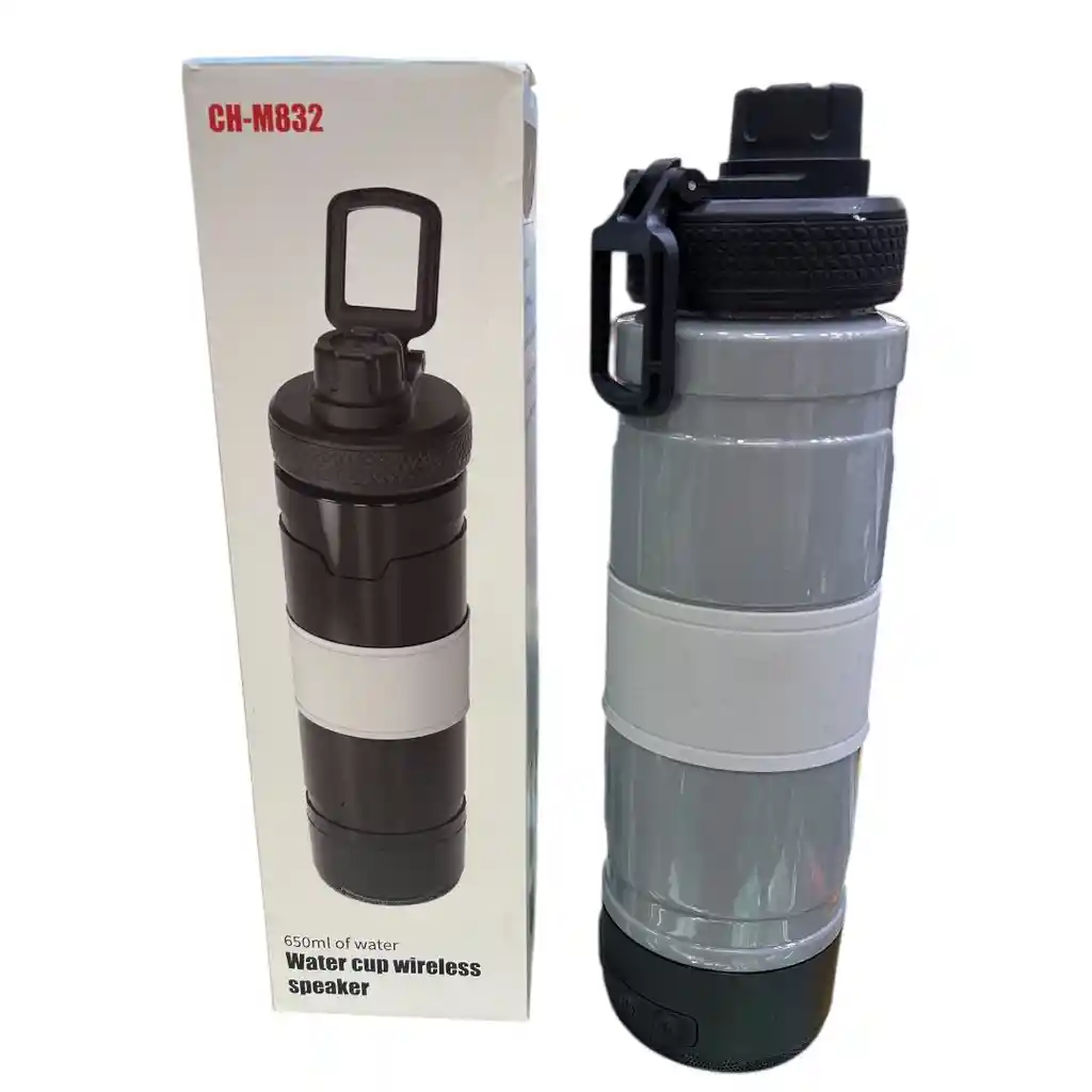El artículo es una botella de agua recargable con altavoz Bluetooth integrado, ideal para actividades al aire libre. Capacidad/Volumen: 650ml. Material: Plástico resistente. Características: Altavoz Bluetooth recargable integrado en la base inferior. Uso: Diseñada para deportes y camping.