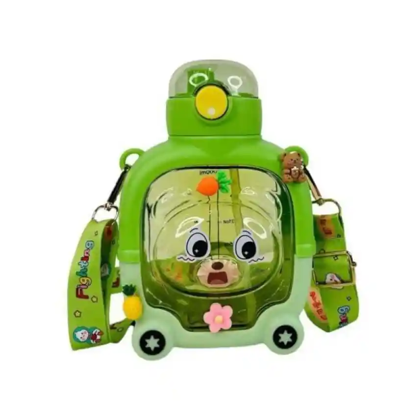Botella Termo Niños Diseño De Oso Con Stikers y Pines CARACTERISTICAS: * Linda botella, botilito o termo de bebida portátil. * Diseño de oso, con correa de transporte de gran capacidad y doble boquilla. * Trae hermosos pines y stickers. * Adhesivo medidor. * Elaborado en PP de calidad alimentaria, seguro y no tóxico, libre de BPA. * Diseño de prevención de fugas de agua. * Puede utilizar para beber té, café, agua, jugo, leche o la bebida que prefieras. DESCRIPCION: - Botilito, botella con diseño de oso, con correa por lo que es fácil de transportar. Ideal para llevar a la escuela, viajes, oficina, gimnasio, excursiones. Perfecto como regalo de cumpleaños para una niña o un niño, un amigo. Viene con 4 stickers para personalizarlas a tu gusto, lo que te permite crear una botella única y llena de personalidad. Además, incluye 4 Pines para añadir un toque tridimensional especial. - Equipada con un pitillo integrado, la botella ofrece facilidad de uso y es fácil de desinfectar, lo que garantiza la practicidad diaria. Fabricada con material de alta resistencia, la botella es duradera y fiable para el uso diario. La protección de silicona añade un toque de suavidad y protección adicional. - Diseño de prevención de fugas, lo que hace que la puedas llevar directamente con su correa o dentro de tu maleta o lonchera. ESPECIFICACIONES: * Capacidad: 1000 ml * Colores: Azul, Rosado, Verde y Café claro. * Contiene: 1 botella de agua. 1 correa 4 pines 4 stickers 1 pitillo.