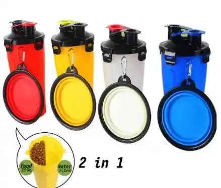 Botilo para porta comida y bebida para tu mascota. Incluye un platito portátil para que lo puedas cargar donde prefieras. Food 250 - Water 350