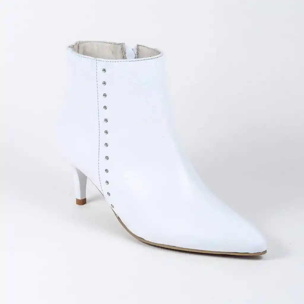Botín blanco, con herrajes al lado, tacón de punta
