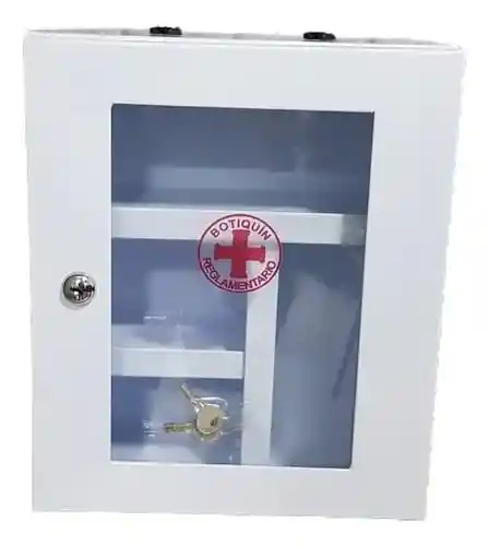 Botiquín metálico con soporte para fijar en la pared o manija para transportar de ser necesario, elaborado en lamina y pintura de alta calidad, con chapa y dos llaves.