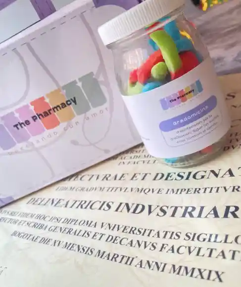 Botiquín con nombres de medicinas de "felicitaciones por tu grado" Relleno: 2 medicinas de gomitas + 1 medicina de chocolate Para la fórmula médica indícanos: Médico (de): Paciente (para):