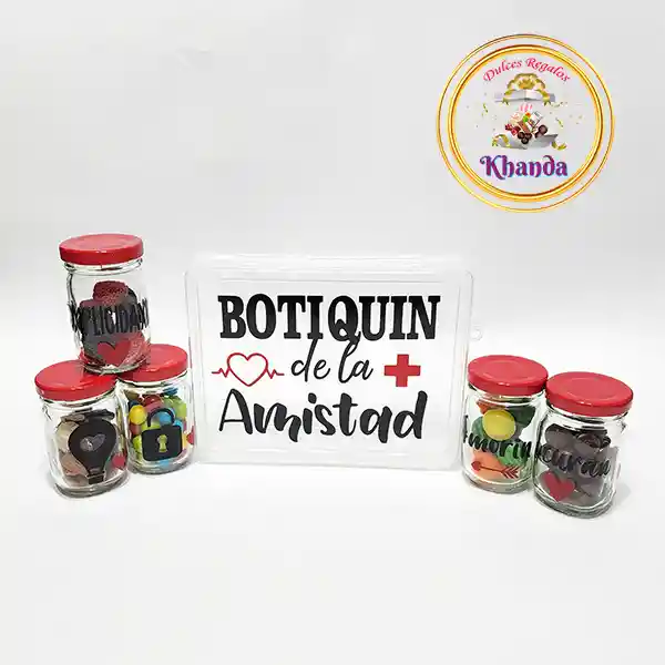 Botiquín Khanda de la Amistad, contiene: 5 frascos de vidrio tapa roja decorados rellenos cada uno con 20gr de Maíz recubierto de Chocolate - 47gr Chicles Ensalada de Frutas (Chicle con sabor a frutas variados) - 40gr de Frutos Secos (Almendras, Uvas Pasas y Nueces) - 46gr Moritas (Gomas rojas y negras de sabores) - 50gr Chicle tipo agogo (Bolitas de Chicle de diferentes sabores) - Empacados en Caja Plástica motivo botiquin de la Dulzura.