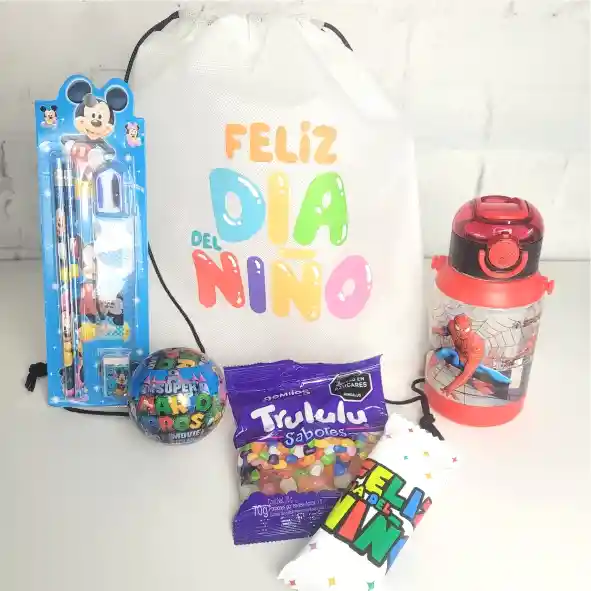 HERMOSA TUTLA PARA NIÑO QUE CONTIENE: 1 BOTILITO DE PERSONAJES (DISEÑOS SURTIDOS) - 1 KIT ESCOLAR DE PERSONAJES SURTIDOS (2 LAPICES, REGLA, BORRADOR, TAJALAPIZ) - 1 BOLA SORPRESA (CONTIENE LLAVERO DE PERSONAJES SURTIDOS) - 1 PAQUETE DE GOMAS - 1 CHOCO GALLETA - TARJETA