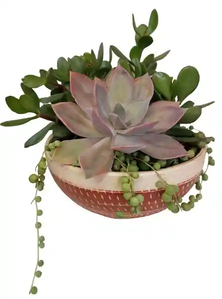 3 especies de suculentas (tono natural), en matera de barro de 10cm de radio, incluye sustrato 100% organico. Altura total 20cm aproximadamente (la altura varia segun la especie).