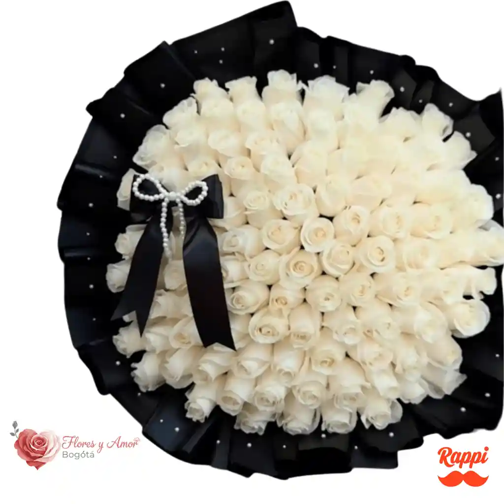 Un imponente bouquet compuesto por 100 rosas blancas cuidadosamente seleccionadas y organizadas en un diseño redondo y abundante que transmite lujo, pureza y distinción. Cada rosa aporta un significado de amor sincero, respeto y admiración, convirtiendo este arreglo en una declaración elegante y memorable. Su envoltura en tono negro con delicados detalles y un lazo decorativo aporta un contraste sofisticado que resalta la belleza natural de las flores, logrando una presentación moderna y de estilo premium. Ideal para aniversarios, celebraciones especiales, propuestas, agradecimientos o para sorprender con un detalle impactante y lleno de significado. Un arreglo diseñado para quienes desean expresar sentimientos profundos con elegancia y grandeza.