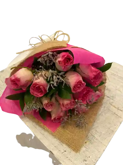 12 rosas en papel con follajes, color sujeto a disponibilidad