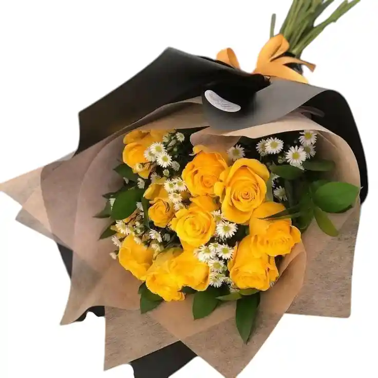 Bouquet 12 rosas amarillas con follajes. creativa envoltura y moño decorativo