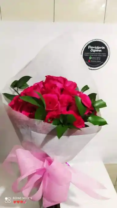 12 rosas Fascia en bouquet con follaje tela y lazo decorativo