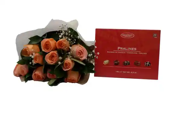 Bouquet Contiene: Rosas Salmón Seleccionadas 12 Unidades + Chocolates Pralinés Importados 180 g + Follaje 1 Und + Alimento Para Flores 1 Und. En Empaque de Regalo Ecológico Moño Decorativo y Tarjeta Personalizada. Personaliza el Mensaje de la Tarjeta en Los Comentarios.