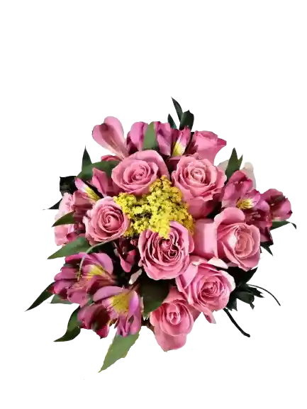12 Rosas tipo importación y 4 astromelias (Color según disponibilidad), 30 cm de largo, incluye decoración y tarjeta (indicar en el chat qué mensaje desea) de color Rosa ideal para el Felicitaciones