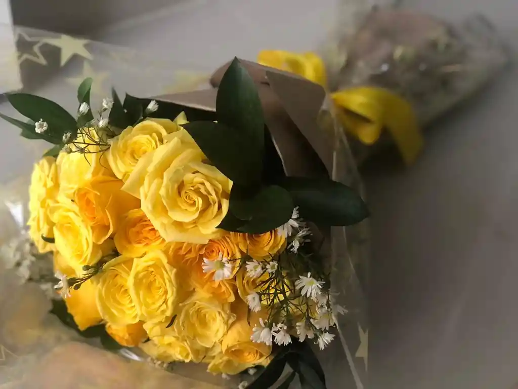 Bouquet de 24 rosas amarillas, follaje envoltura y tarjeta