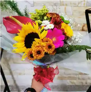 10 Lirios y follaje surtido con capuchón, velo y moño decorativo.