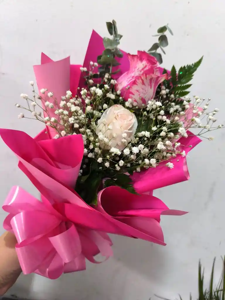 arreglo tipo bouquet elaborado con rosas, el color del papel y tono rosado de la rosa puede variar