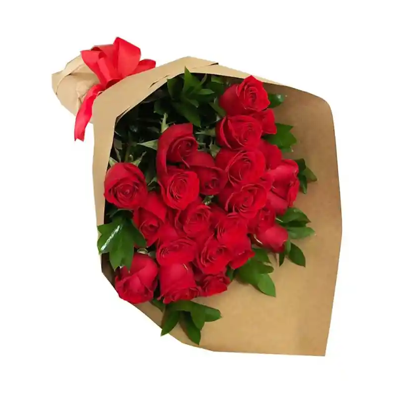 24 Rosas Rojas, fino follaje, papel decorativo, Moño, y Tarjeta para mensaje.