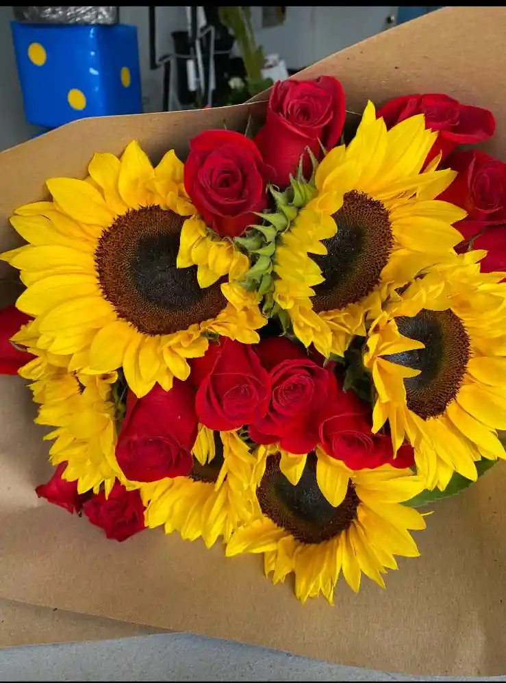 Bouquet de 24 rosas y 6 girasoles (Hasta 2 tonos a eleccion sengun disponibilidad)Con mensaje personalizado max 50 caracteres, (Dejar mensaje en el chat y remitente, de lo contrario no se podra visualizar)